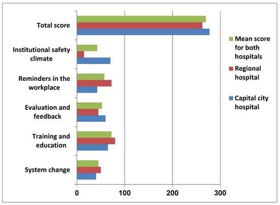 The overall hand hygiene level scores for the Capital City hospital and the Regional hospital were 277.5 and 262.5 respectively. The mean score for both hospitals is 270. Therefore, both hospitals reached the intermediate hand hygiene level. The regional hospital has higher scores in the domains of system change, reminders in the workplace, and training and education. On the other hand, the hospital in the Capital City scored higher in evaluation and feedback and institutional safety climate than the regional hospital as shown in Figure 2.