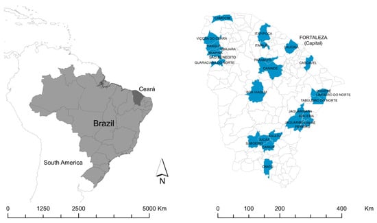 Location of Ceará State in Brazil, and location of the municipalities included in the study.