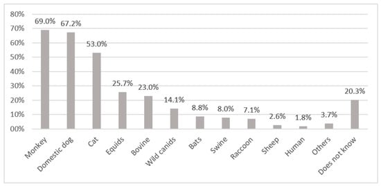 Animals or categories of animals reported by respondents to be rabies virus transmitting animals. Others: snake (0.9%), parrot (0.9%), jaguar (0.9%), goat (0.9%), opossum (0.1%).