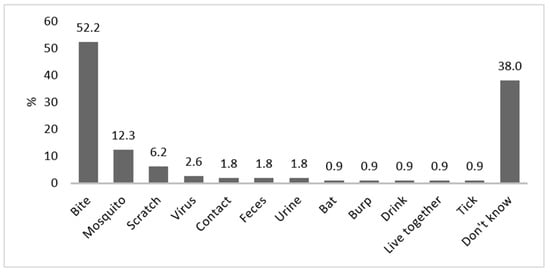 Knowledge on the mode of transmission was weak, and 38% did not know the mode of transmission at all. About 52% mentioned correctly animal bites and 6% scratches, but 12% believed that mosquitoes would transmit rabies. Other incorrect modes of transmission cited by respondents included transmission by urine and feces (Figure 3).