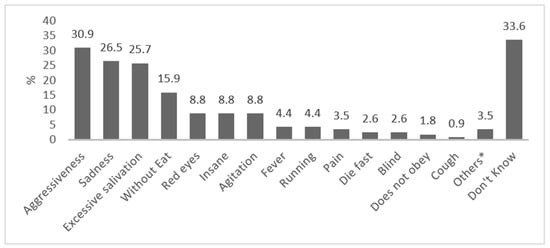 The symptoms/clinical signs cited by the respondents are presented in Figure 4. Three common symptoms and signs—aggressiveness, salivation and anorexia—were among the topmost mentioned responses.