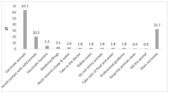 Almost 64% answered animal vaccination as a form of prevention, followed by 20% who stated avoidance of contact with wild animals. Other answers that are not adequate measures of rabies prevention included: medication, not stressing the animals and taking care of the animals’ food, water and hygiene (Figure 5).