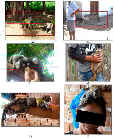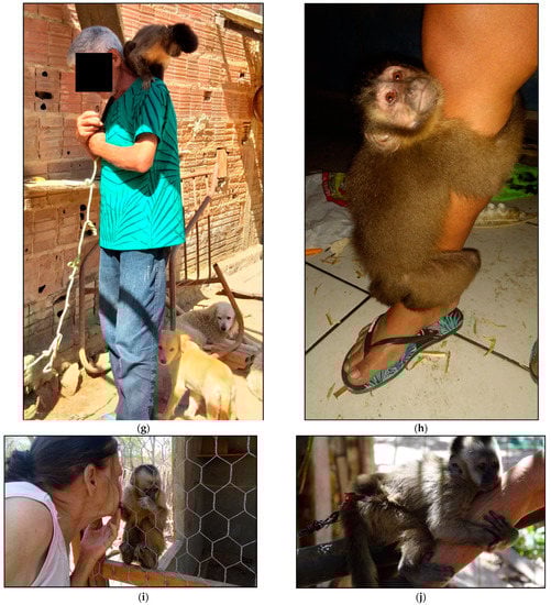 Examples of contact of wild animals with domestic animals and the population: (a) monkey living in the same environment as domestic dogs and cats; (b) domestic dog (Canis familiaris) and domesticated wild canid (Cerdocyon thous) living in the same environment; (c) human contact with marmosets in backyard; (d) human contact with monkey in backyard; (e,f) human contact with marmoset. (g–j) nail monkey breeders in contact with the animals.