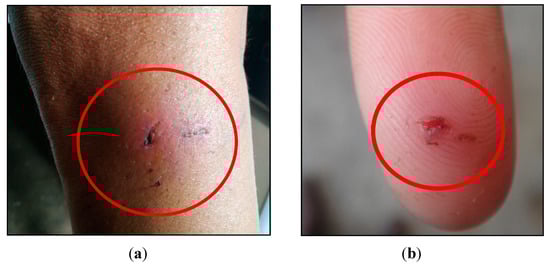 Examples of aggressions by wild animals to humans: (a) bite by a capuchin monkey at the leg of a person; (b) marmoset aggression on the index finger of a person.
