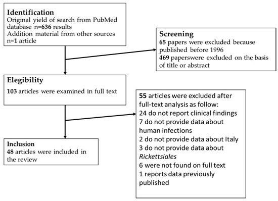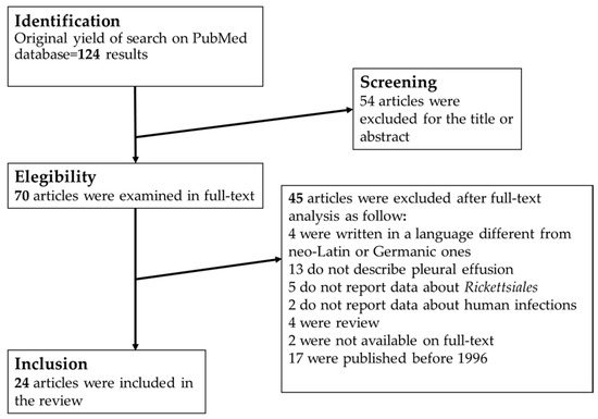 Guccione C, Rubino R, Colomba C, Anastasia A, Caputo V, Iaria C, Cascio A. Rickettsiosis with Pleural Effusion: A Systematic Review with a Focus on Rickettsiosis in Italy. Tropical Medicine and Infectious Disease. 2022; 7(1):11. https://doi.org/10.3390/tropicalmed7010011