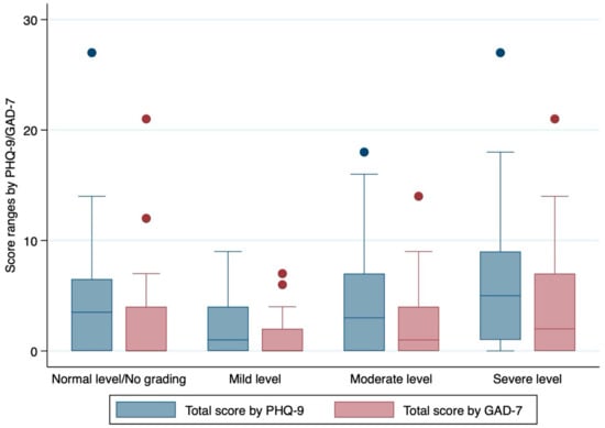 Especially, statistically significant difference in total score by PHQ-9 (p = 0.0202) and total score by GAD-7 (p = 0.0011) were observed amongst the severity levels of COVID-19 patients. Both depression score by PHQ-9 and anxiety score by GAD-7 were highest in the severe group (Figure 1).