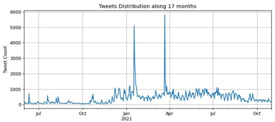 The time series containing the daily amounts of tweets for the second corpus is presented in Figure 2, considering seventeen months, from 1 June 2020 to 31 October 2021.