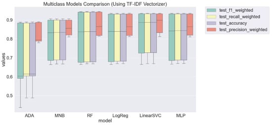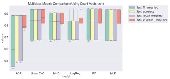 The RF with TF–IDF vectorizer and uni-grams presented the best accuracy (0.95), followed by RF (with count vectorizer and uni-grams), LogReg, LinearSVC, and MLP, both with the two vectorizers and uni-grams, with accuracies of 0.94. Figure 3 contains the boxplots for the overall performances of models with count vectorizer considering the weighted scores.