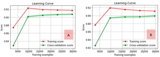 Learning curves for both MNB cases are similar. The count vectorizer model is slightly superior and tends to converge faster than the same model using TF–IDF, between 0.90 and 0.92, close to 30,000 examples. For both vectorizers, accuracy started below 0.88 for training and below 0.84 for cross-validation curves, but with close to 10,000 examples, training curves achieved their peaks, softly decreasing until close to 30,000; moreover, cross-validation kept increasing tendencies after 10,000 until 30,000 examples. Confusion matrices and ROC curves for MNB cases in the analysis are presented in Figure 6.