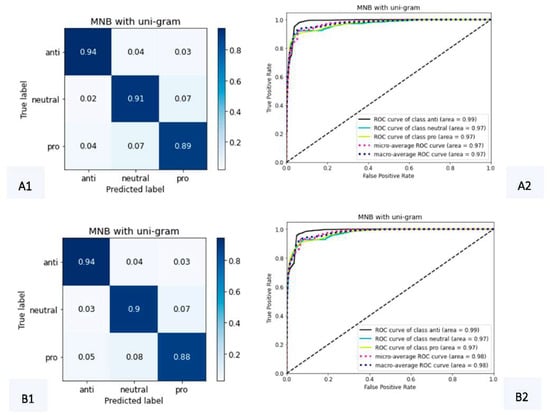 Confusion matrices and ROC curves for MNB with count (A1,A2) and TF–IDF (B1,B2) vectorizers, using uni-grams.
