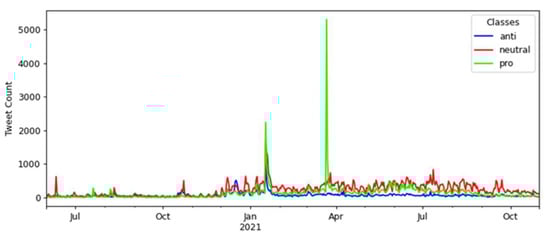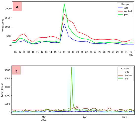In the interval between January and February 2021, the first peak can be explained by the beginning of the application of the first vaccine shot on 17 January 2021, in the state of São Paulo. In the interval between March and April 2021, when the second peak occurred, there was a presidential announcement in a national broadcast on 23 March 2021 about the COVID-19 pandemic and the measures related to the vaccination campaign in Brazil that may have caused this high number of tweets.