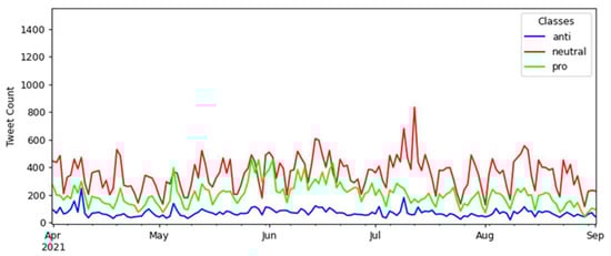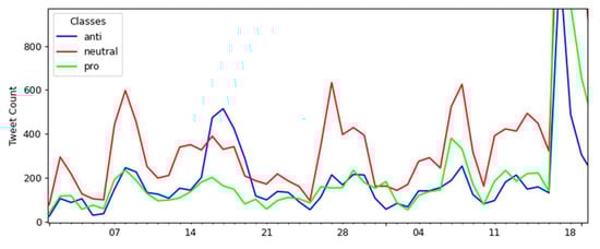 The temporal analysis focused on presenting variations in the number of tweets according to the multiclass classification, seeking to identify specific dates with notable class variations. A manual search was carried out through the social web to find news about events possibly influencing the detected variations.