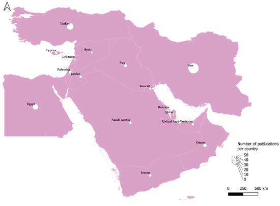 Geographical distribution of the Middle Eastern publications. Map created with DIVA-GIS version 7.5 and designed with QGIS 3.16.1 Hannover.