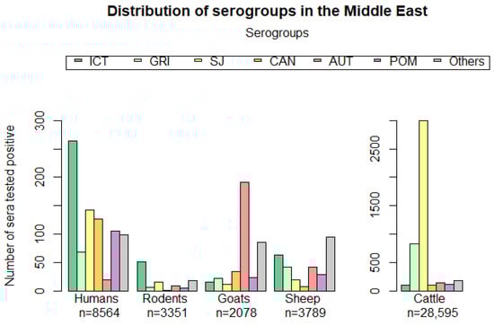 Distribution of serogroups in the five major hosts in the Middle East. Plot created by RStudio (RStudio Team (2021), RStudio: Integrated Development Environment for R; RStudio, PBC, Boston, MA, USA; URL http://www.rstudio.com/, accessed on 22 June 2022).