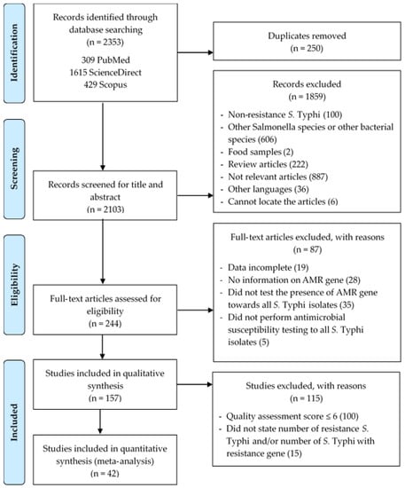 Chicago/Turabian StyleYusof, Nik Yusnoraini, Nur Iffah Izzati Norazzman, Nur Fatihah Mohd Zaidi, Mawaddah Mohd Azlan, Basyirah Ghazali, Mohamad Ahmad Najib, Abdul Hafiz Abdul Malik, Mohamad Aideil Helmy Abdul Halim, Muhammad Nor Syamim Mohd Sanusi, Annur Ashyqin Zainal, and et al. 2022. "Prevalence of Antimicrobial Resistance Genes in Salmonella Typhi: A Systematic Review and Meta-Analysis" Tropical Medicine and Infectious Disease 7, no. 10: 271. https://doi.org/10.3390/tropicalmed7100271