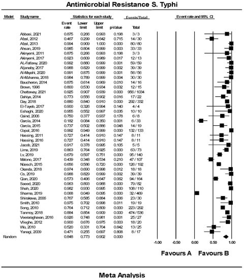 3.3. The Pooled Prevalence of Antimicrobial Resistant Strains in S. Typhi