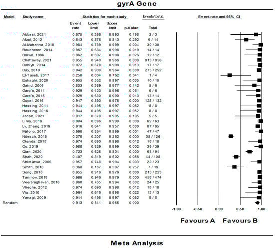 3.4. The Pooled Prevalence of gyrA Gene in S. Typhi