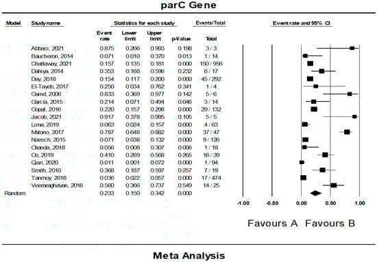 3.6. The Pooled Prevalence of parC Gene in S. Typhi