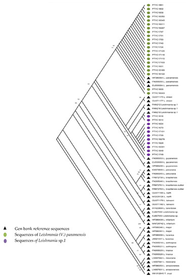 Maximum Likelihood Phylogenetic Tree based on the alignment of 1286 nucleotides from the hsp-70 gene sequence. Distances were estimated using the Kimura-3 parameter model. Reference sequences (gen hsp70) appear with a black triangle. The sequences of group A: Leishmania (V.) panamensis (n = 21) and Leishmania sp.1 (n = 11) are identified with green and purple circles, respectively. The sequences of group B, being similar, were not included.