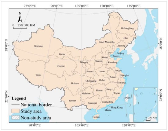 The study area is mainland China, with a geographical coverage of 31 provincial-level administrative regions, including 22 provinces, 5 autonomous regions, and 4 municipalities directly under the central government. It does not include Hong Kong and Macao special administrative regions and Taiwan province, as their statistical caliber of data differs somewhat from that of mainland China (Figure 1).