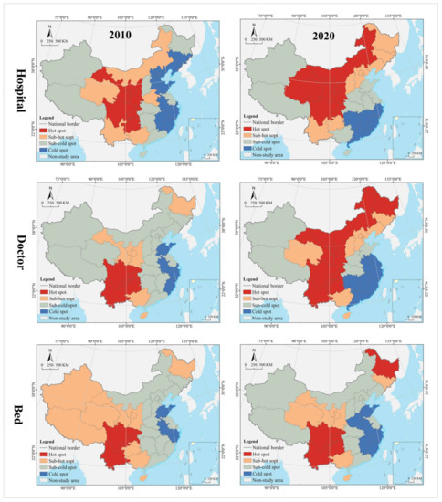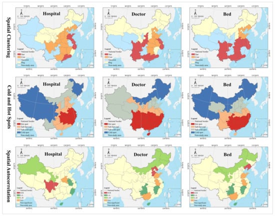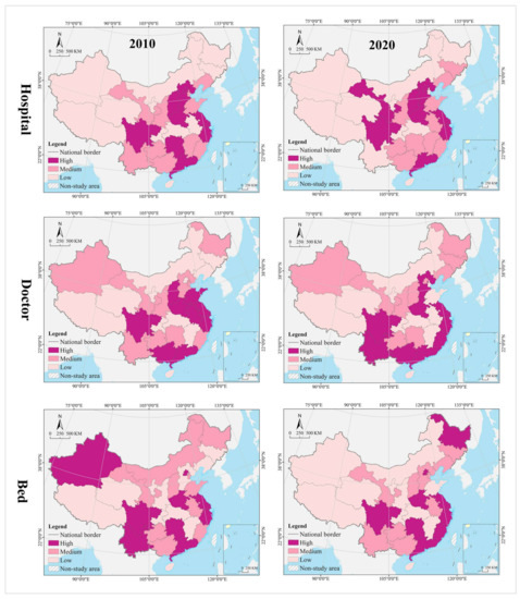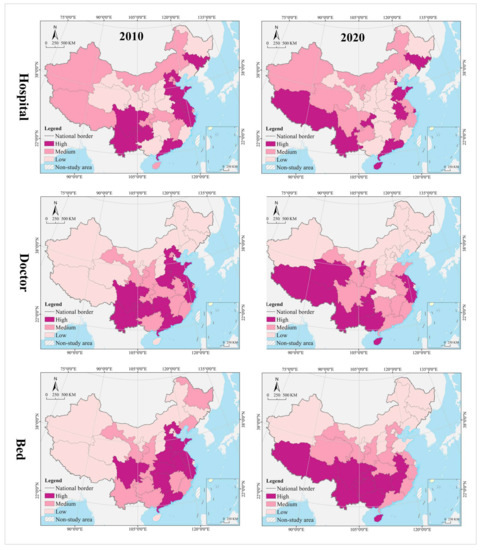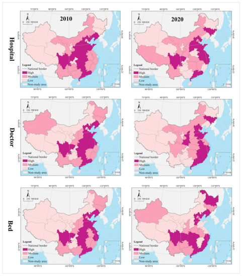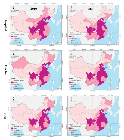 The change speed of medical resources showed gradient agglomeration, and the high-middle-low level areas shaped a center-periphery spatial structure in geographical distribution. Using the GIS spatial clustering quantile analysis tool, the change speed of hospitals, doctors, and beds in 31 provinces from 2010 to 2020 were divided into three categories, i.e., high, medium, and low, with thresholds of 1.52% (Yunnan) and 0.75% (Jiangxi), 5.90 (Guangxi) and 4.75 (Henan), and 7.48% (Guangxi) and 5.87% (Hebei), respectively. In terms of hospitals, the high-level regions were scattered in distribution, including Guangdong, Hainan, Chongqing, Yunnan, Tibet, Shandong, Tianjin, Shanghai, Anhui, and Jilin. The medium-level provinces were on the periphery of those of high level, mostly clustered in west and north China. Most of the low-level provinces were clustered in central and south-central China, the Loess Plateau, and the Bohai Bay. Tibet recorded the largest average annual growth (3.41%), while Heilongjiang recorded the largest decline (−0.76%). The average of change speed for hospital was 1.14%, with 48.39% of provinces exceeding it. In terms of doctors, the high-level provinces were mostly clustered in the Yunnan-Guizhou Plateau in the southwest and the Qinghai-Tibet Plateau; the medium-level provinces were distributed in the periphery of those of high level, and the low-level provinces were distributed in north China (especially in northern and northeast China). The largest average annual growth of doctors was in Tibet (9.41%), and the smallest was in Heilongjiang (1.69%). The average of change speed for doctor was 5.26%, with 45.16% of provinces exceeding it. In terms of beds, the provinces of high, medium and low level were clustered in a gradient distribution along the north–south direction, with the largest annual growth in Guizhou (10.13%) and smallest in Beijing (3.19%). The average of change speed for bed was 6.16%, with 61.29% of provinces exceeding it.