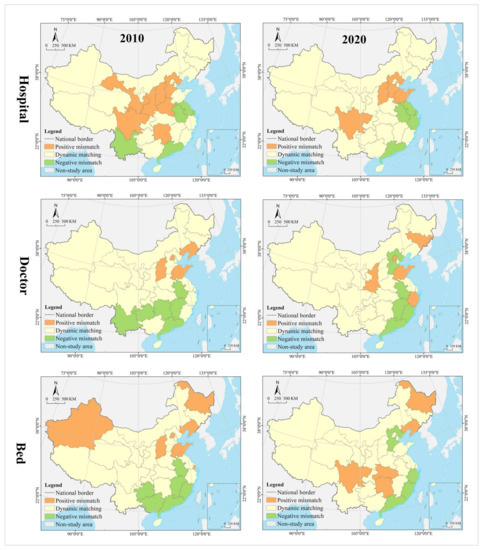 In 2010, the provinces with higher contribution to bed mismatch were clustered in the central and coastal regions in an “X” shape, with those of medium of distributed in their periphery, as well as those of low level clustered in northwest China. Provinces of high level in 2020 were distributed in a band in the middle and upper reaches of the Yangtze River and the southeast coast, including Sichuan, Chongqing, Hubei, Hunan, Shandong, Fujian, Zhejiang, Hebei, and Liaoning. Most of the provinces of medium were clustered in the north and south of the high level, including Yunnan, Guizhou, and Guangxi in the southwest and Shaanxi, Henan, and Anhui in the central part of the country. Provinces of low level were mostly clustered in the Qinghai-Tibet Plateau and Loess Plateau, with a small number randomly distributed in the coastal areas, including Shandong and Jiangsu.
