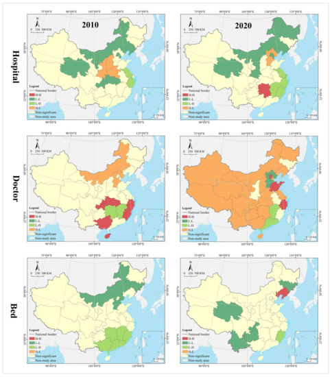 In 2010 and 2020, the provinces with high contribution to hospital mismatch were clustered in the Yangtze River Delta, Pearl River Delta, and upper and lower reaches of the Yellow River, with those of medium level distributed in their periphery, low level clustered in west and north China, and middle reaches of the Yangtze River Economic Belt. In 2010, the provinces with high contribution to doctor mismatch were clustered in the lower reaches of the Yangtze River, Yellow River, and south China, with those of medium level distributed in the periphery and extending northwest; those of low level clustered in the Qinghai-Tibet Plateau, the middle reaches of the Yangtze River, and northeast China. Provinces of high level in 2020 shaped a coastal agglomeration in the east and extended north to Henan and Hebei and west to Yunnan and Sichuan. Provinces of medium level were clustered in northeast and northwest China, with those of low level clustered in the Qinghai-Tibet Plateau and middle reaches of the Yellow River. The provinces with high contribution to bed mismatch in 2010 were scattered in distribution, including Jiangsu, Zhejiang, Henan, Beijing, Guangdong, Hunan, Yunnan, Sichuan, and Xinjiang. Provinces of medium level were relatively clustered in north China and Beibu Gulf, with those of low level clustered in the Qinghai-Tibet Plateau, central China and Bohai Bay. In 2020, most of the provinces of high level were clustered in a belt-like pattern along the coast, with those of medium level clustered in southwest China and Bohai Bay, and those of low level clustered in the west, north, and central China (Figure 14).