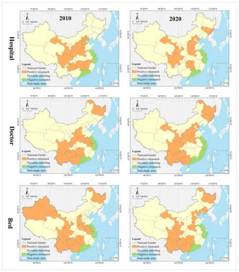 The change range of medical resources was characterized by clustering, and the spatial pattern of hospitals, doctors, and beds varied widely. Using the GIS spatial clustering quantile analysis tool, the change range of hospitals, doctors, and beds in 31 provinces from 2010 to 2020 were divided into three categories—high, medium, and low. The thresholds were 3460 (Guizhou) and 1178 (Hubei), respectively. 212,640 (Guizhou) and 89,469 (Shanghai), 177,200 (Zhejiang) and 81,500 (Gansu). From the perspective of hospitals, the high-level provinces were clustered in the eastern coastal regions and the Yunnan-Guizhou Plateau in the southwest; the medium-level provinces were distributed in a zonal pattern along the western and northern borders, while the low-level provinces were mostly clustered in the central, central south, and Loess Plateau regions. Shandong had the largest number of new hospitals (17,905), compared to the largest number of hospital reductions (−3317) in Hunan, and Liaoning, Heilongjiang, Henan, Shaanxi, and Gansu provinces saw varying degrees of reductions in the number of hospitals. It is worth noting that the northeast and northwest regions, such as Liaoning, Heilongjiang, and Gansu not only have serious population loss problems, but also experienced negative economic growth. From 2010 to 2020, their hospital reduction, doctors, and beds increase, whether this complex change phenomenon is reasonable needs to be further analyzed by other methods (spatial dislocation part). From the perspective of hospitals, the high-level provinces were clustered in the eastern coastal regions and Pan-Pearl River Delta urban agglomeration; the medium-level provinces were distributed in the middle of the two high-level clusters, and the low-level provinces were in north (including northeast and northwest) and west China. The largest number of new doctors was in Guangdong (413,426), while the smallest was in Tibet (24,333). From the perspective of beds, the high-level provinces covered most of the eastern and central regions, the medium-level provinces were distributed in the periphery of those of high level, mostly clustered in the Yunnan-Guizhou Plateau in the southwest and Loess Plateau in the northwest, and the low-level provinces were clustered in the west and north. The largest increase in beds was in Sichuan (348,500), while the smallest was in Tibet (90,700) (Figure 5).
