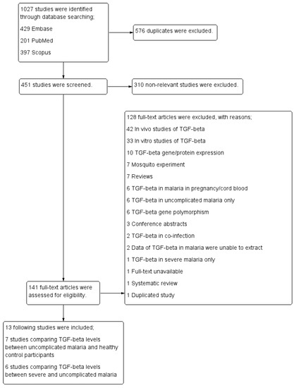 A total of 1027 articles were retrieved from PubMed (201 articles), Scopus (397 articles) and Embase (429 articles). After 576 articles were excluded, 451 articles were screened for titles and abstracts. After 310 non-related articles were excluded, 141 articles were examined for full texts. For specific reasons, after the screening of full texts, the following articles were excluded: 42 were TGF-β in vivo studies, 33 were TGF-β in vitro studies, 10 were TGF-β gene/protein expression studies, 7 were mosquito experiments, 7 were reviews, 6 were TGF-β in pregnancy/cord blood, 6 were TGF-β in uncomplicated malaria only, 6 were TGF-β gene polymorphism studies, 3 were conference abstracts, 2 were TGF-β in co-infection, 1 was about TGF- β in severe malaria only, 1 had no full-text available, 1 was a systematic review, and 1 was a duplicate study. Finally, 13 studies were included [26,27,33,34,35,36,37,38,39,40,41,42,43]: 7 studies [33,34,35,36,37,38,39] comparing TGF-β levels between uncomplicated malaria and healthy controls and 6 studies [26,27,40,41,42,43] comparing TGF-β levels between severe and uncomplicated malaria (Figure 1).