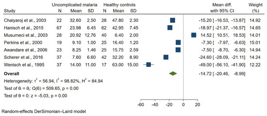 The difference in TGF-β levels between patients with uncomplicated malaria and healthy controls was estimated using available data from seven studies [26,27,33,38,39,40,42] that enrolled 233 patients with uncomplicated malaria and 239 healthy controls. The meta-analysis showed lower mean TGF-β levels in patients with uncomplicated malaria than healthy controls (p < 0.01, pooled MD = −14.72 pg/mL, 95% CI = −20.46 to 8.99 pg/mL, I2 = 98.82%; seven studies; Figure 2). The meta-regression analysis using study design, continent, age group, Plasmodium spp., method for malaria detection and method for TGF-β quantification as covariates demonstrated that continent and age group confounded the pooled MD (p < 0.01 from each analysis); therefore, subgroup analyses of continent and age group were further performed.