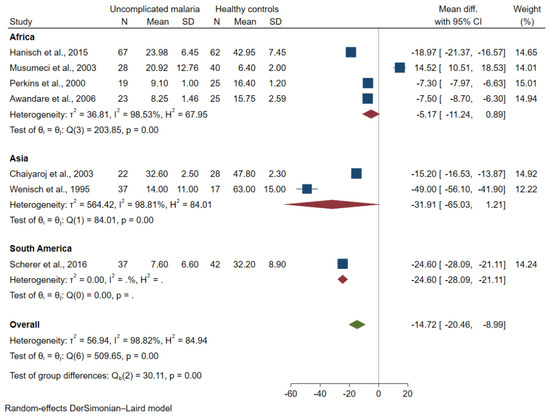Figure 3. Forest plot demonstrating a difference in mean TGF-β levels (pg/mL) in uncomplicated malaria and healthy controls by continents [26,27,33,38,39,40,42]. Grey y-axis line, line of no effect size; blue square boxes, mean TGF-β levels from each study; line on the left and right of blue square boxes, 95% CI; green diamond; overall effect size; crimson diamond, overall effect size in each subgroup; I2, H2 and τb2, heterogeneity measures.