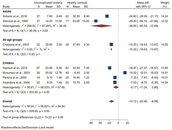 Figure 4. Forest plot demonstrating a difference in mean TGF-β levels (pg/mL) in uncomplicated malaria and healthy controls by age groups [26,27,33,38,39,40,42]. Grey y-axis line, line of no effect size; blue square boxes, mean TGF-β levels from each study; line on the left and right of blue square boxes, 95% CI; green diamond; overall effect size; crimson diamond, overall effect size in each subgroup; I2, H2 and τb2, heterogeneity measures.