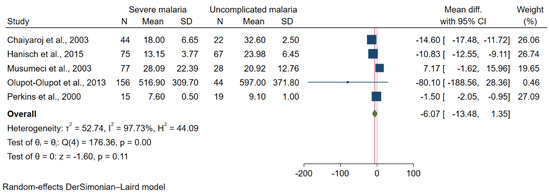 The difference in TGF-β levels between severe and uncomplicated malaria was estimated using available data from six studies that enrolled 367 patients with severe malaria and 180 patients with uncomplicated malaria [26,27,40,41,42]. The meta-analysis results show no difference in mean TGF-β levels between the two groups (p = 0.11, pooled MD = −6.07 pg/mL, 95% CI = −13.48 to 1.35 pg/mL, I2 = 97.73%; five studies; Figure 5). The meta-regression analysis using study design, continent, age group, Plasmodium spp., method for malaria detection, and method for TGF-β quantification as covariates demonstrated that these covariates did not confound the pooled MD (p > 0.05 from each analysis); therefore, subgroup analysis was not further performed. The difference in TGF-β levels between children with severe and uncomplicated P. falciparum malaria was estimated using available data from four studies [26,40,41,42]. The meta-analysis results show no difference in mean TGF-β levels between the two groups (p = 0.44, pooled MD = −3.12 pg/mL, 95% CI = −11.01 to 4.76 pg/mL, I2 = 97.26%; four studies; Supplementary Figure S3).