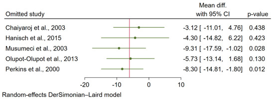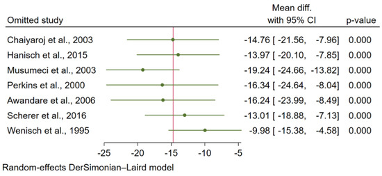 Figure 6. Sensitivity analysis determining the robustness of the meta-analysis results of the difference in TGF-β levels (pg/mL) between uncomplicated malaria and healthy controls [26,27,33,38,39,40,42].