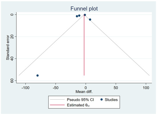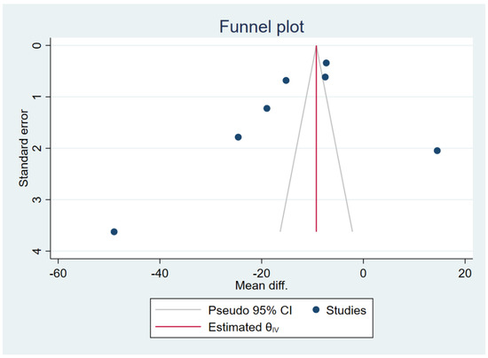 Figure 7. Sensitivity analysis determining the robustness of the meta-analysis results of the difference in TGF-β levels (pg/mL) between severe and uncomplicated malaria [26,27,40,41,42].