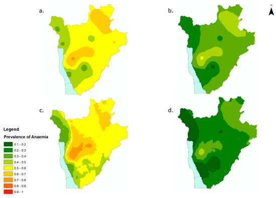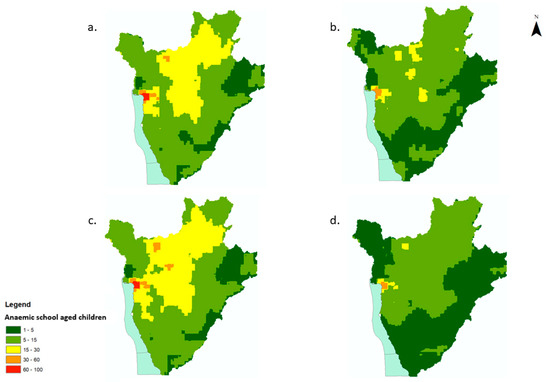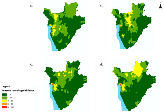 Predicted prevalence maps of anaemia per year for school-aged children (5–15 yrs) in Burundi, 2008–2011. (a) 2008, (b) 2009, (c) 2010, (d) 2011.