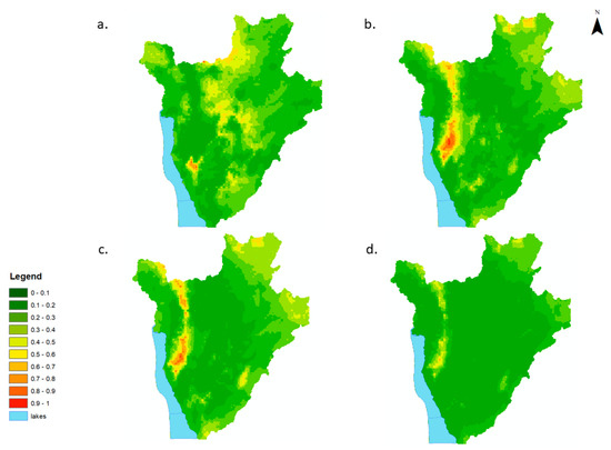Predicted prevalence maps of low-severity anaemia per year for school-aged children (5–15 yrs) in Burundi, 2008–2011. (a) 2008, (b) 2009, (c) 2010, (d) 2011.