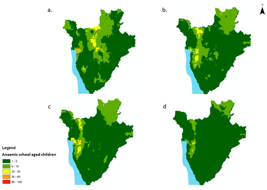 Estimated number of school-aged children (5–15 yrs) with moderate/high-severity anaemia in Burundi, 2008–2011, per 550 m2. (a) 2008, (b) 2009, (c) 2010, (d) 2011.