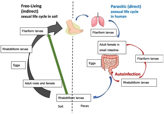 The autoinfection life cycle occurs when the rhabditiform larvae develop into invasive filariform larvae prior to expulsion in stools. Subsequently, reinfection occurs during filariform larvae penetration into the intestinal mucosa (internal autoinfection) or perianal skin (external autoinfection) []. This unique autoinfection cycle enables S. stercoralis to cause persistent or even lifelong infection. The simultaneous detection of rhabditiform and filariform larvae in stools can reflect the autoinfection that usually occurs in hyperinfection syndrome or in immunosuppressed hosts []. Theoretically, the autoinfection life cycle spans 2–3 weeks. Thus, antiparasitic treatment should be administered in repeating 2–3-week intervals to ensure cure of strongyloidiasis [].