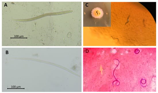 The culture techniques, such as Harada Mori culture, polyethylene tube culture, and agar plate culture have higher sensitivity than stool concentration techniques and are recommended as the laboratory investigations of choice. However, the disadvantages of the culture techniques are time consumption, high cost, availability limitations, and requirement for fresh stool samples [,]. For instance, agar plate culture, which is the most efficient stool culture technique, requires fresh stools and 2–3 days to detect migrating rhabditiform larvae on agar (Figure 2C). Stool culture techniques only enable detection of Strongyloides spp., Trichostrongylus spp., and hookworm larvae, thus requiring other stool examination techniques for the identification of concurrent parasite infections.