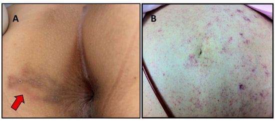 Most people with chronic strongyloidiasis are asymptomatic or have mild symptoms. The common GI symptoms include abdominal bloating, epigastric pain that worsens by eating, intermittent vomiting, diarrhea, constipation, and borborygmus. Larva currens, a rapid intradermal migration of larvae (5–15 cm/h), is the pathognomonic skin lesion (Figure 3A) []. Other skin manifestations include urticarial and recurrent maculopapular rashes. A meta-analysis reported that the significant symptoms associated with chronic strongyloidiasis were abdominal pain, diarrhea, and urticaria [].