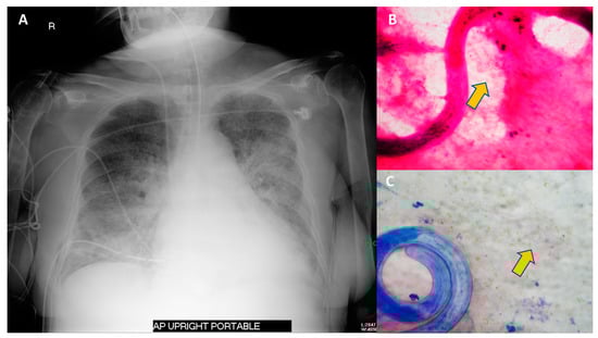 A retrospective study reported the common clinical manifestations of Strongyloides hyperinfection syndrome which included fever (80.8%), respiratory (88.6%), and GI (71.2%) symptoms []. The pulmonary symptoms of hyperinfection syndrome included cough, shortness of breath and asthma-like presentations; acute respiratory distress can also occur []. However, diagnostic difficulties may arise as immunocompromised patients often possess underlying pulmonary diseases, or the symptoms might be masked by secondary infections. Chest radiography is often variable. The classic bilateral or focal interstitial infiltrates can be detected. However, the consolidations and abscesses can occur especially with concurrent bacterial pneumonia. Sputum examination demonstrates filariform or rhabditiform larvae and even occasionally eggs [].