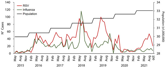 Cases of respiratory syncytial virus and influenza associated with hospitalization in Peru, 2015–2021.