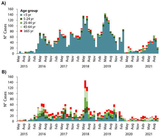 Monthly hospitalizations from the RSV (A) and the influenza virus (B) by age group in Peru, seasons from 2015 to 2021.