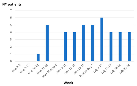 A total of 42 patients were studied, all of them male. A total of 37/42 reported recent sexual contact with other men, 2/42 reported contact with women, 1 reported bisexual relations, and 2 did not answer this question. Only one patient reported contact with a person with obvious skin lesions. Eighty per cent of the MSM reported three or more sexual contacts in the month prior to the illness that included anonymous sex. Figure 1 shows the dates of the diagnosis of the patients.