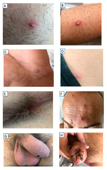 - Davido, B.; D’Anglejan, E.; Jourdan, J.; Robinault, A.; Davido, G. Monkeypox 2022 outbreak: Cases with exclusive genital lesions. J. Travel Med. 2022, 6, taac077. [Google Scholar] [CrossRef]