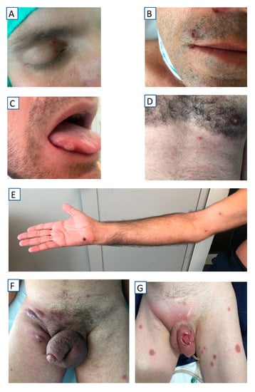 - Quattri, E.; Avallone, G.; Maronese, C.A.; Cusini, M.; Carrera, C.G.; Marzano, A.V. Unilesional monkeypox: A report of two cases from Italy. Travel Med. Infect. Dis. 2022, 49, 102424. [Google Scholar] [CrossRef]