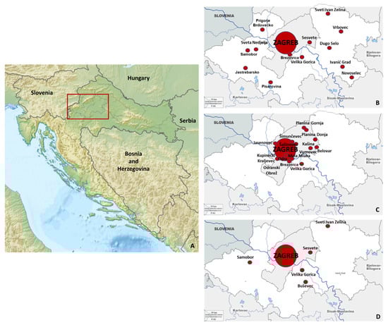 Sampling area in continental Croatia (A): human (B), horse (C), and pet animals (D) sampling areas.