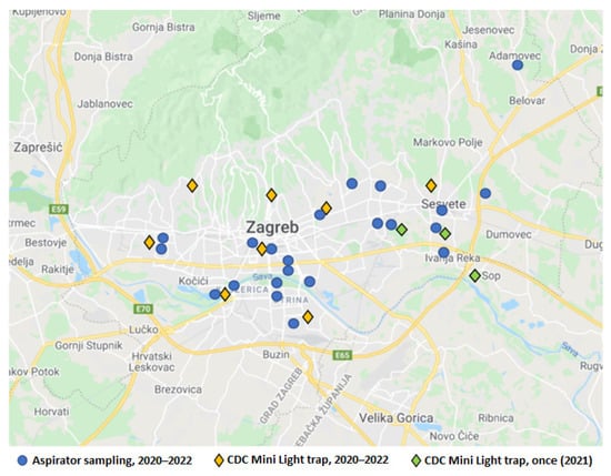 - Klobucar, A.; Benic, N.; Krajcar, D.; Kosanovic-Licina, M.L.; Tesic, V.; Merdic, E.; Vrucina, I.; Savic, V.; Barbic, L.; Stevanovic, V.; et al. An overview of mosquitoes and emerging arboviral infections in the Zagreb area, Croatia. J. Infect. Dev. Ctries. 2016, 10, 1286–1293. [Google Scholar] [CrossRef]