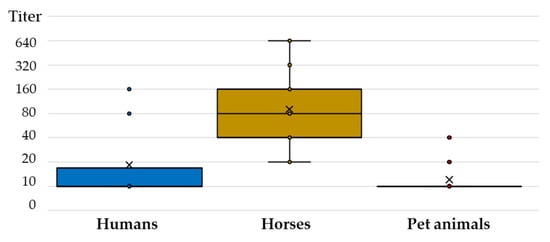Comparing the TAHV NT antibody titers, a substantially higher titer was observed in horses (median 80, IQR = 40–160) compared to humans (median 10, IQR = 10–40) and pet animals (median 10, IQR = 10–10) (Figure 4).